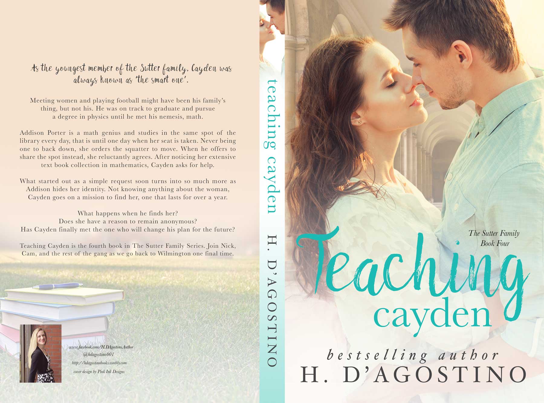 It's a surprise #CoverReveal!!! Teaching Cayden- book 4 in The Sutter Family Series from H. D'Agostino releases February 15th on Amazon, B&N, Kobo, and iBooks. Add it to your TBR list now. Go back to Wilmington one last time with Nick, Cam, and the gang in the final book in The Sutter Family Series. Cover Design by Pink Ink Designs. #TeachingCayden #CollegeRomance #CaydenSutter #StandaloneWithinASeries #ComingSoon #OneClick #NewAdultRomance